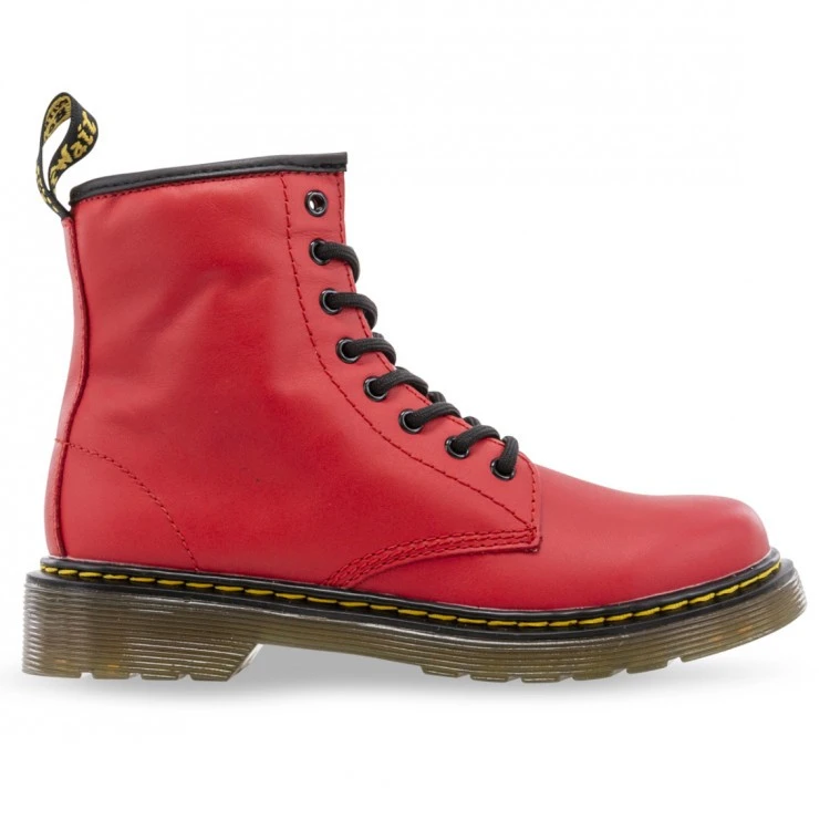 24488636 Dr. Martens is for the children. An adorable shrunken version of the iconic 1460 boot, all eight eyelets are retained in this bright red leather youth size run. Soft leather upper, medial ankle zip for easy access and a durably comfortable AirWair sole. + Leather Upper + Lace Up + Medial Zip + AirWair Sole