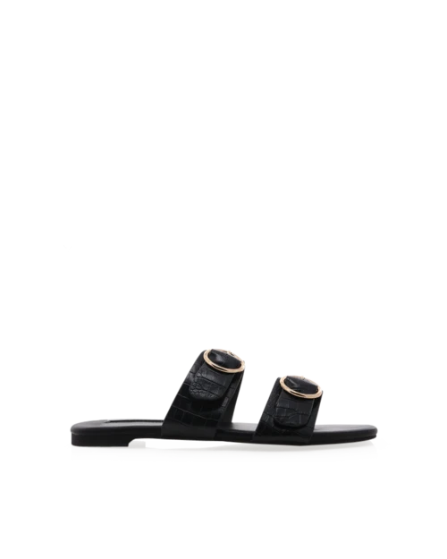 Alaia by Billini is a chic everyday slide. Give your casual summer style a luxe finishing touch with the easy-to-wear slides. Featuring; padded flat sole open soft square toe two wide straps across toe and vamp adjustable gold buckle detail on straps open heel counter easy slip on design synthetic upper, lining and outsole Available in Black Croc and White Clay Croc.