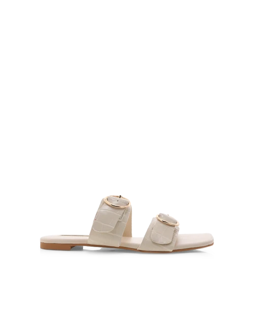 Alaia by Billini is a chic everyday slide. Give your casual summer style a luxe finishing touch with the easy-to-wear slides. Featuring; padded flat sole open soft square toe two wide straps across toe and vamp adjustable gold buckle detail on straps open heel counter easy slip on design synthetic upper, lining and outsole Available in Black Croc and White Clay Croc.
