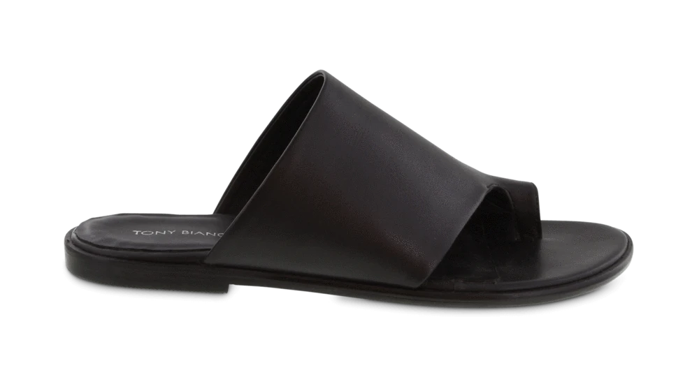 Simple and sleek, the Ariana leather flat is your go-to sandal this season. Made with a smooth black leather upper and a comfortable toe-ring, this style is finished with a rounded toe and a 1cm heel height. -Material:Leather upper & leather lining -Fit:True to size -Toe-shape:Rounded toe shape -Heel height:1cm