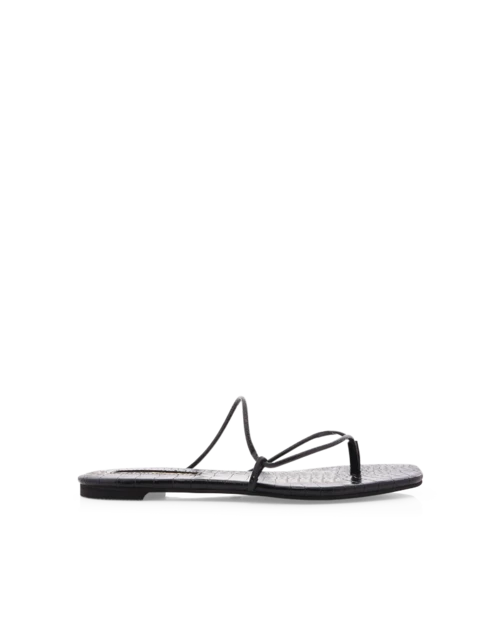 Ariel by Billini is a thong-style slide. Chic and easy to wear, Ariel is bound to become a staple of your summer wardrobe . Featuring; padded flat sole open soft almond toe easy slip on design thin strappy thong style upper open back design synthetic upper, lining and outsole Available in Black Croc and White Clay Croc.