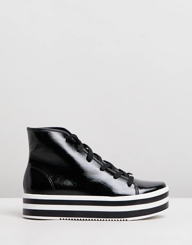 – Lace-up front; blind eyelets; gold-toned branding plate to base