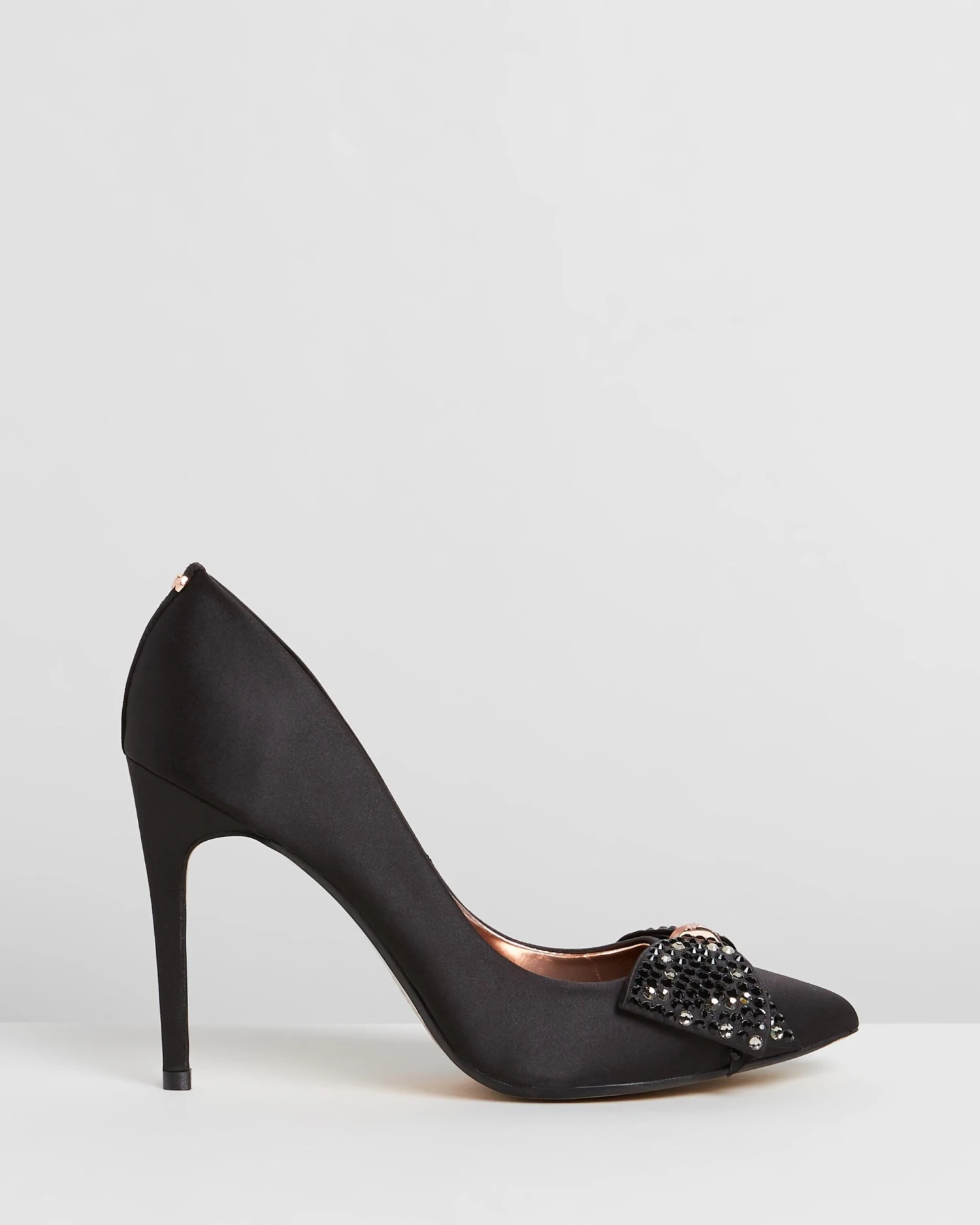 Embodying chic feminine style, Ted Baker’s Aselly Pumps are crafted from black satin with a glinting jewelled bow across the vamp and a sleek pointed toe, perfect for adding a touch of sparkle to your footwear edit.- Smooth satin upper; leather lining