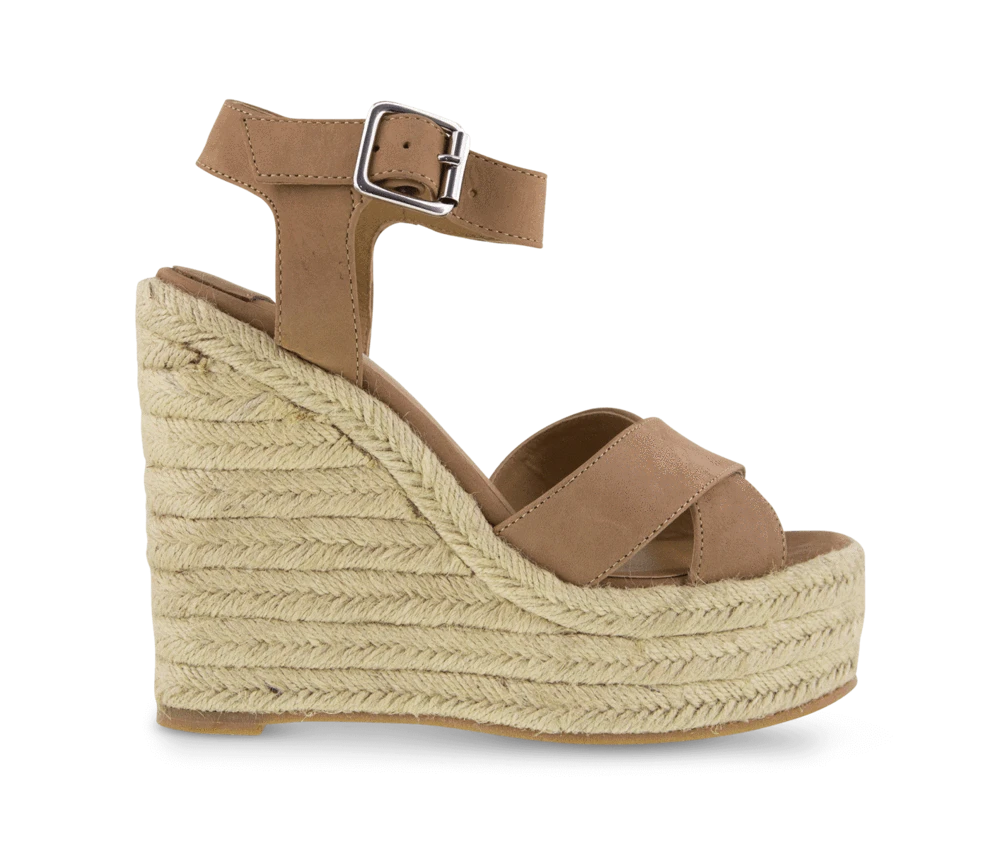 Embrace extra height with the Boston espadrille wedges. Featuring an exposed platform wedge heel with a tan nubuck upper, crossover toe-straps and an ankle buckle closure. -Material:Leather upper, synthetic lining -Sole:Rubber sole -Fit:True to size -Toe-shape:Rounded toe shape -Wedge height:13cm -Platform height:4.5cm