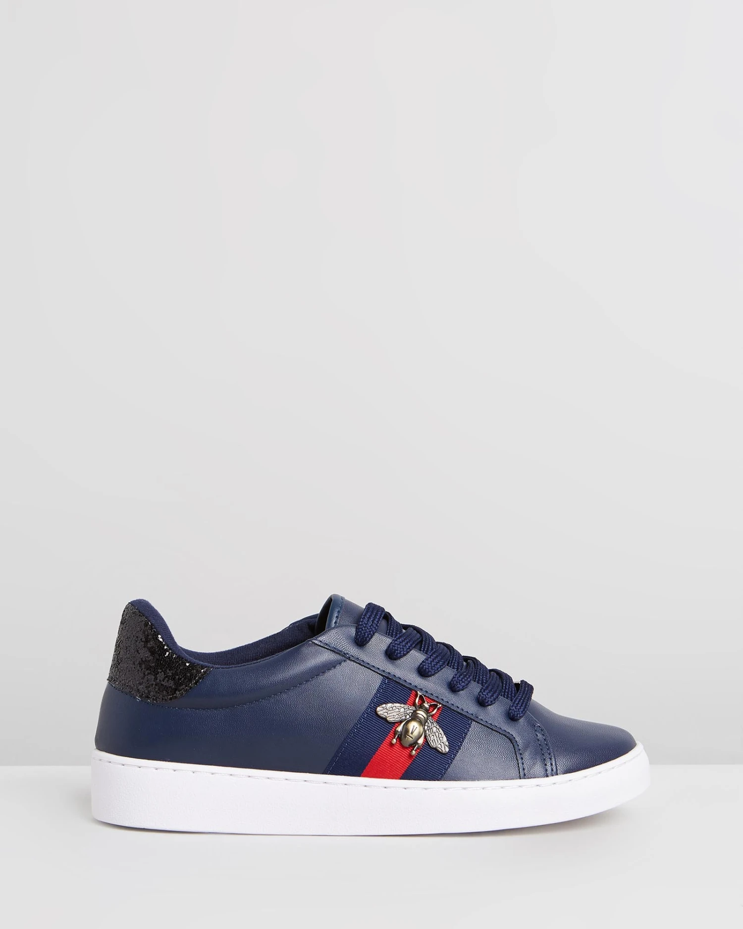 – Smooth navy blue; red and navy blue stripes; black sequinned heel collar; gold-toned hardware