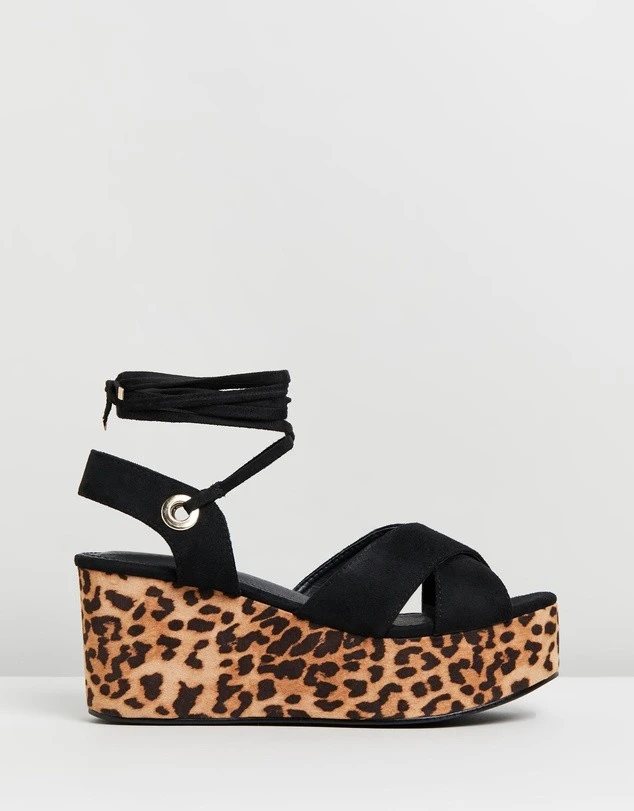 Perfect for an evening out, the Chica Flatform Wedges by Dazie boast a tie-up design with a black microsuede upper and an on-trend leopard print base. – Microsuede upper