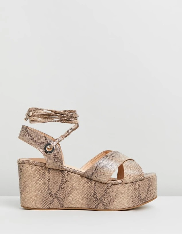 Perfect for an evening out, the Chica Flatform Wedges by Dazie boast a tie-up design with a tonal brown snakeskin print and glinting gold-toned finishes. – Faux leather upper; snakeskin-textured finish