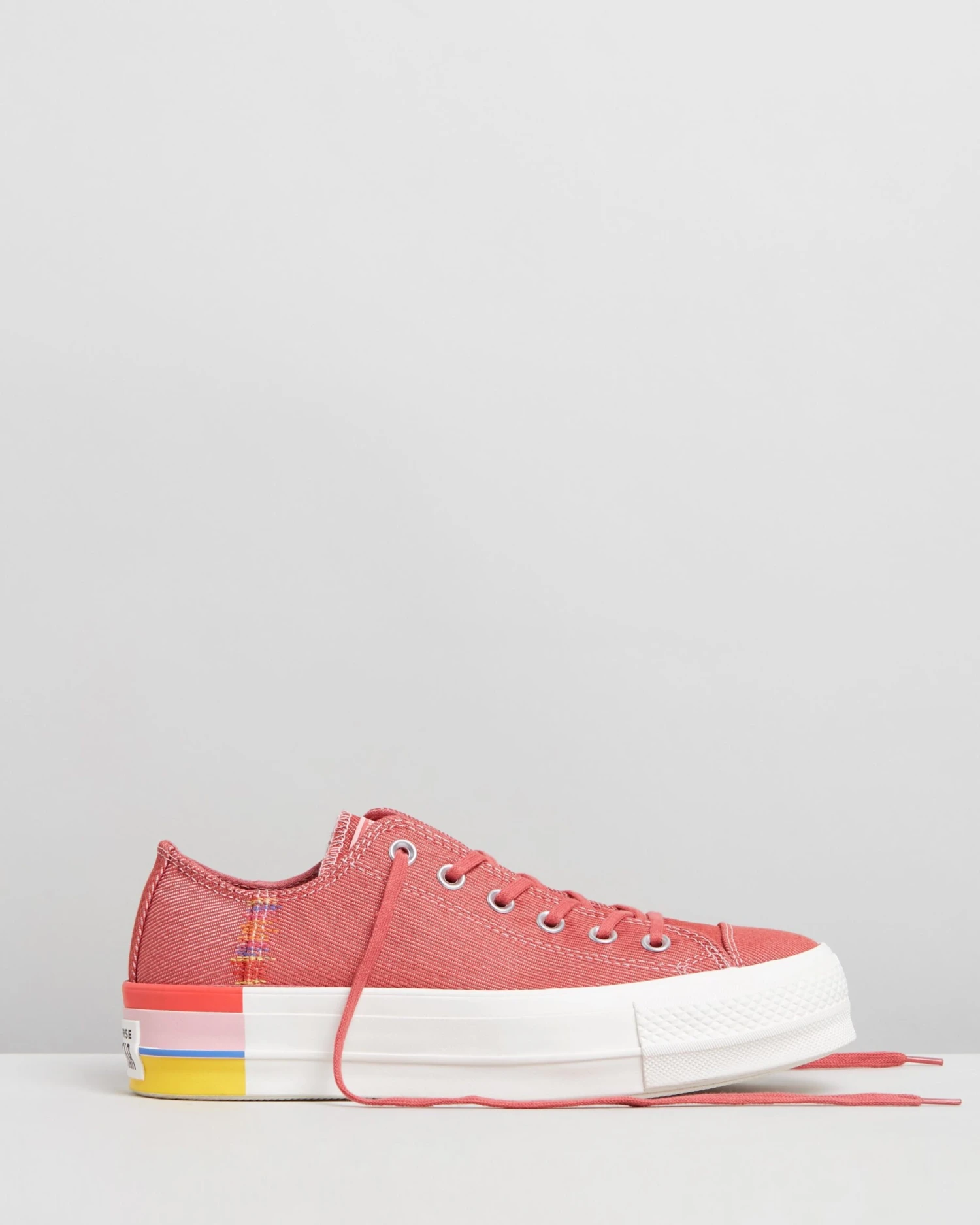 Radiating feminine street appeal, the Chuck Taylor All Star Lift Rainbow sneakers by Converse are crafted with a woven twill upper and finished with an elevated rubber sole. – Woven twill upper