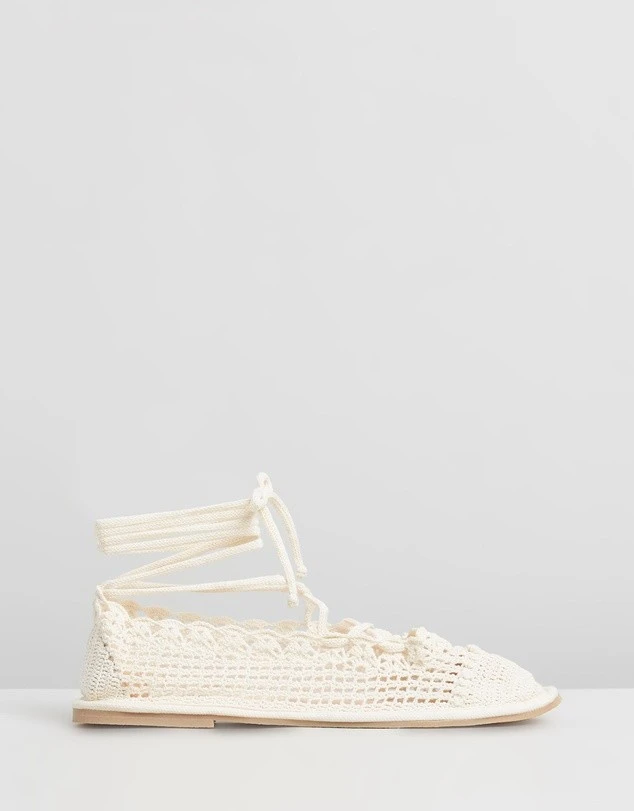 It-girl Alexa Chung has come out with her namesake fashion label this season that emulates the style-icon’s inimitable aesthetic. The Crochet Travel Pumps are crafted in a delicate cream-coloured crochet with feminine scalloped edging. The collar is cinched with a crochet shoestring that wraps around the ankle to fasten the shoe to the foot. Style the bohemian inspired flats with a feminine floral mini dress and a nonchalant attitude for a look inspired by the designer. – Crochet upper, slight stretch; leather lining