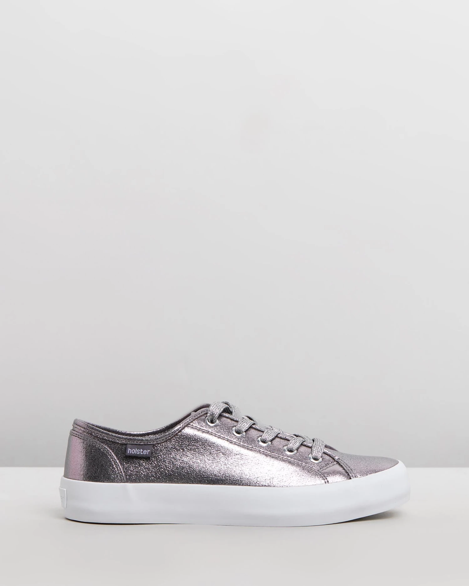 Covered in a pewter metallic sheen, Holster’s Cupid sneakers are a glitzy update on the classic low-top silhouette.