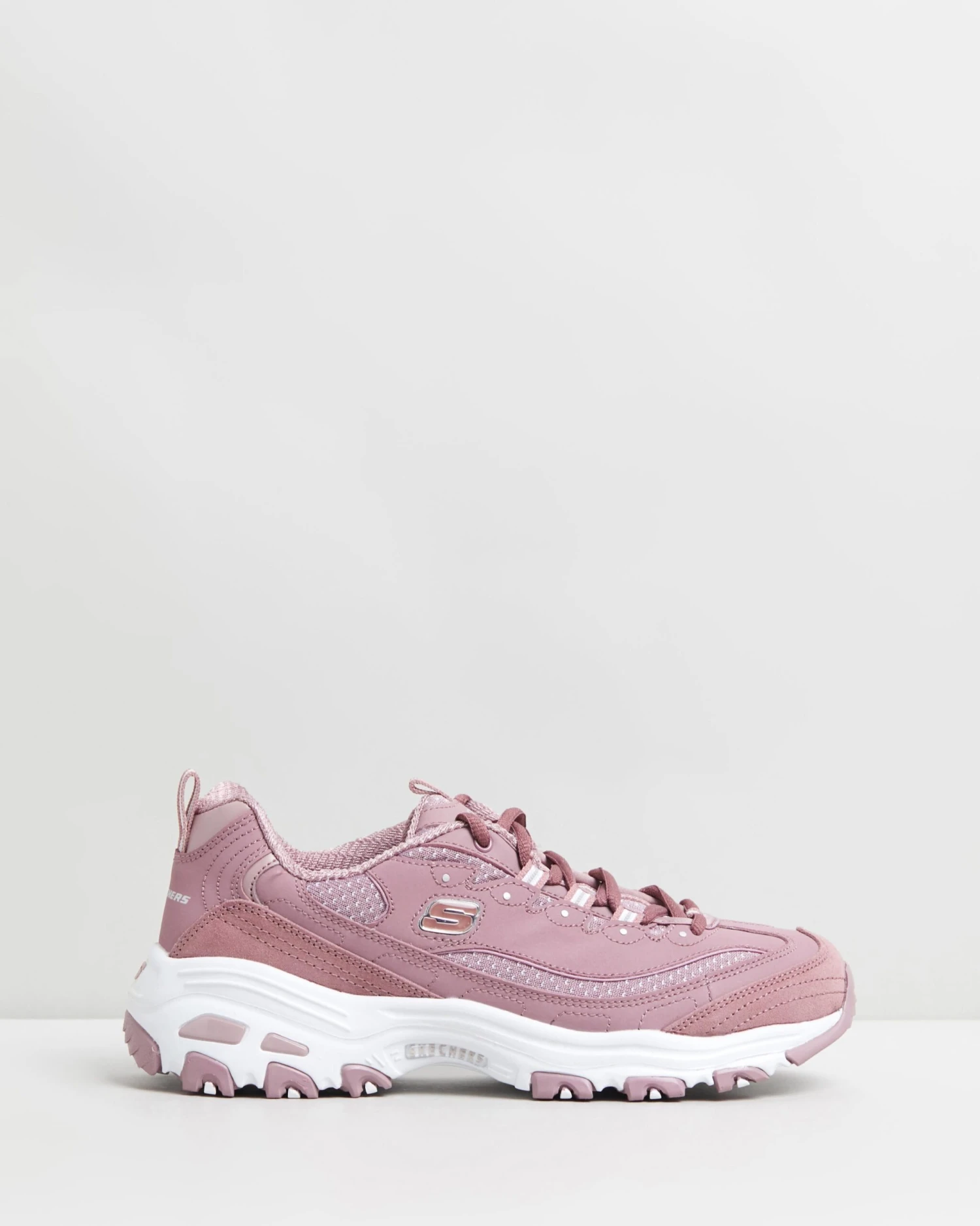 The lightweight D’Lites – Polka Nite sneakers from Skechers boast a chunky sneaker silhouette with a panelled leather and jacquard knit upper and cushioned Air-Cooled Memory Foam