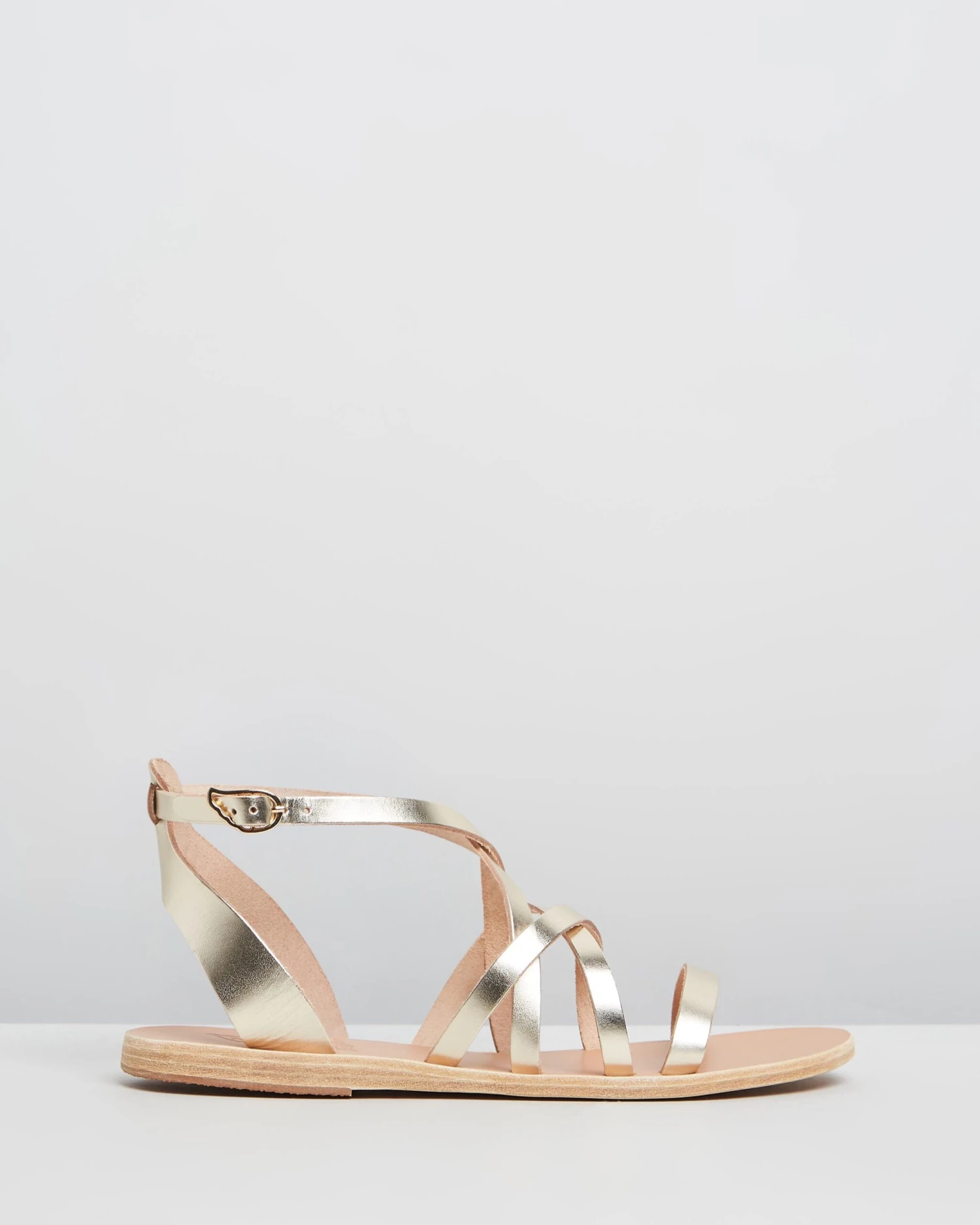 Step into the sartorial flair of a Grecian deity with Ancient Greek Sandals and their stunning Delia sandals. Exclusively handcrafted in Greece, these artistically strapped flats are fashioned from genuine leather and rendered in an almost mythological, metallic gold. Embracing the heritage from which they arise, Delia is an open heel and toed indulgence secured with a winged buckle that alludes to the divine god Hermes. – Genuine leather upper