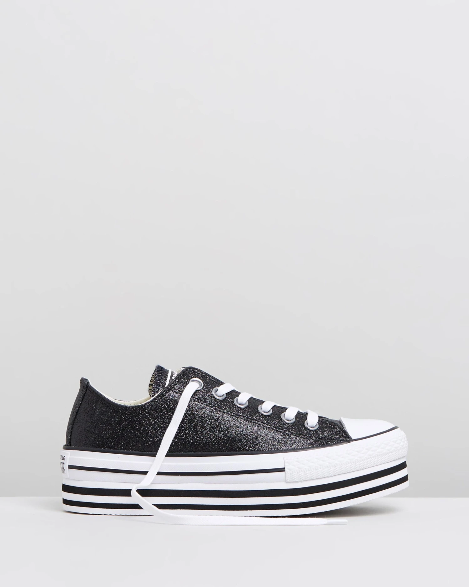 Worked in a jet black glitter construction, the Double Stack Platform sneakers by Converse are the perfect pair to elevate a street-style look. – Low-top silhouette with glitter upper