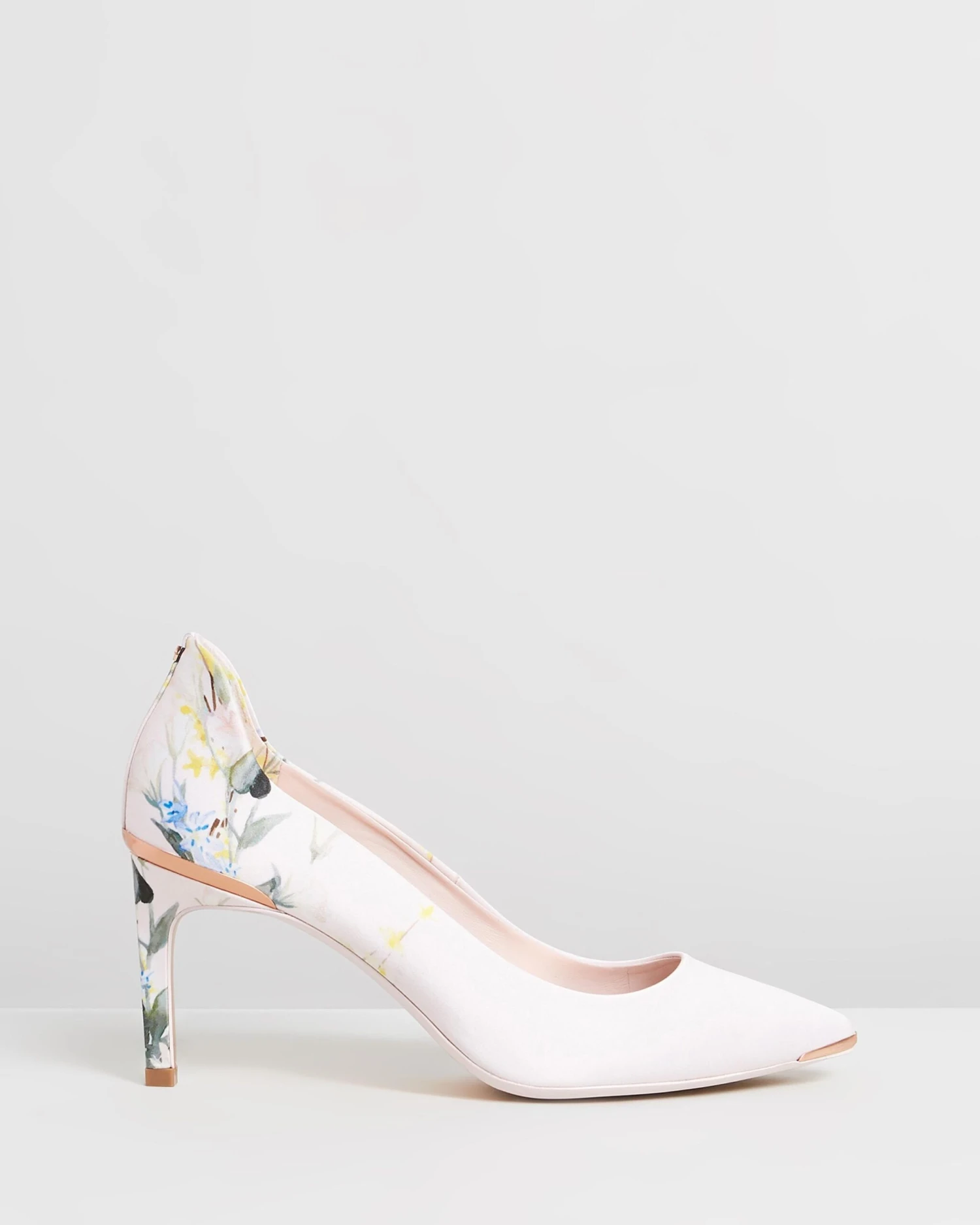 Embodying chic feminine style, Ted Baker’s Eriinp Pumps are crafted from petal pink satin with a pointed toe and subtle floral design to the heel. – Smooth satin upper; leather lining