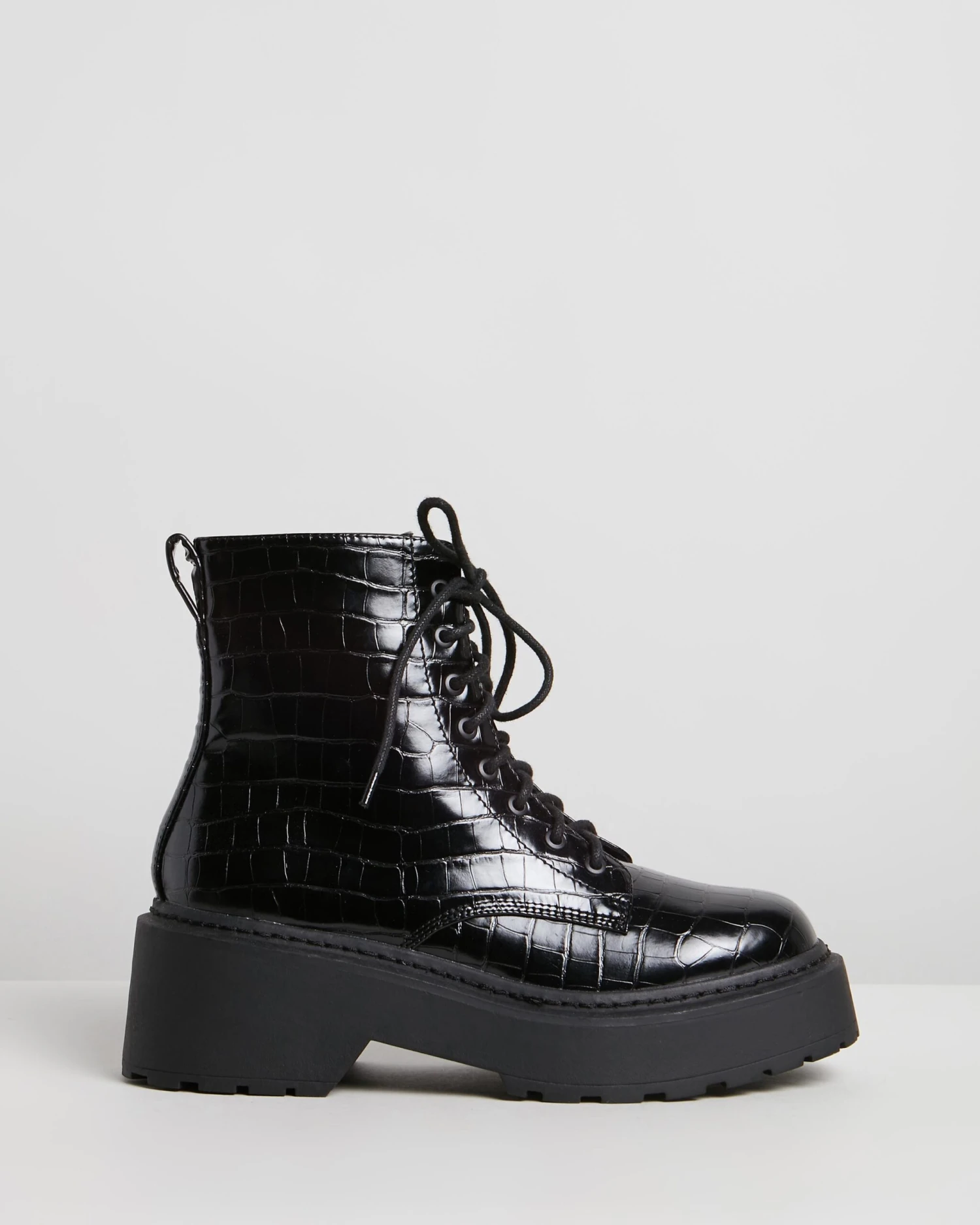 Bring immediate edge to your wardrobe with the Fizz Ankle Boots from Dazie, shaped with a lace-up front and set atop a chunky rubber sole.- Faux leather upper; croc-embossed finish