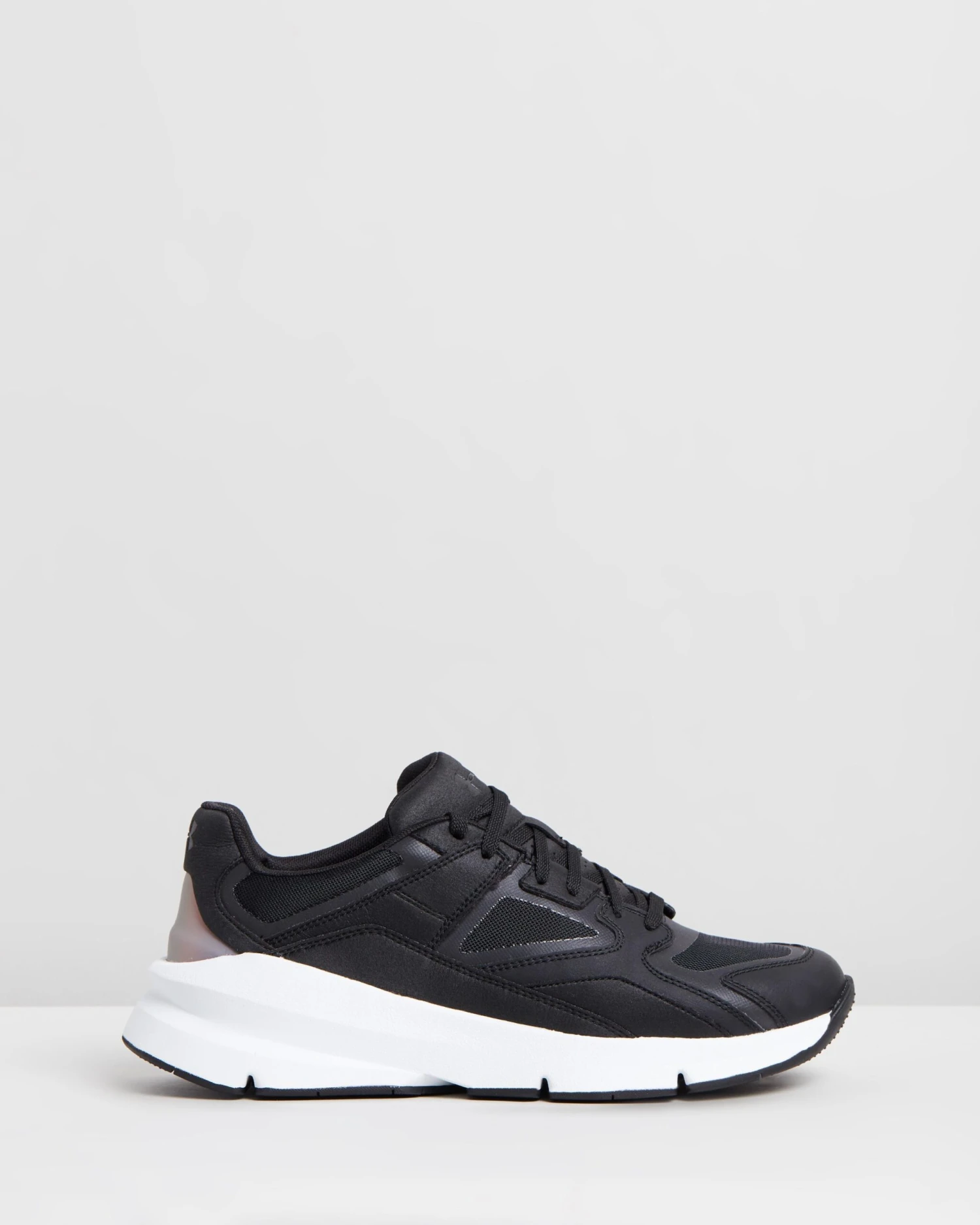 – Black shade; white outsole; iridescent purple heel counter