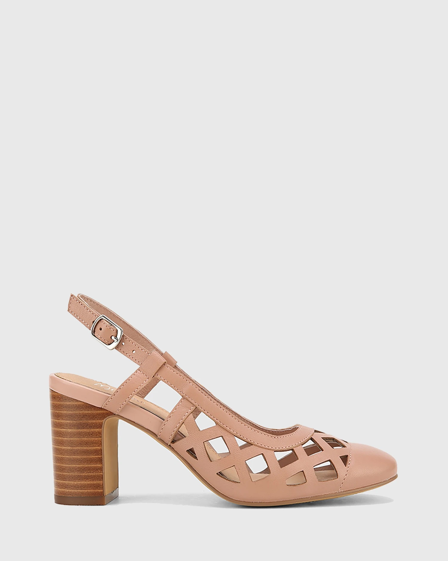 The Gildan Leather Laser Cut Sling Back Pumps by Wittner feel like summer. Stunning petal pink leather with laser cut detailing contrasts perfectly with a chunky stack block heel resulting in a fun and feminine shoe.