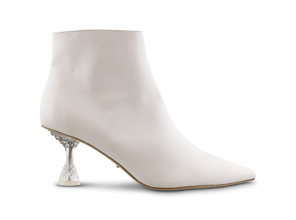 A combination of this seasons hottest trends – white ankle boots and interesting heels. Introducing Glam, a glamorous ankle boot designed with a sleek pointed toe, exposed zip pulls and a striking detailed mid-height heel. Pair yours with midi-skirts or straight-leg pants. -Material: Leather upper, synthetic lining + sole -Toe shape: Long pointed toe -Features: Clear heel + Exposed side zipper -Heel height:6.5cm