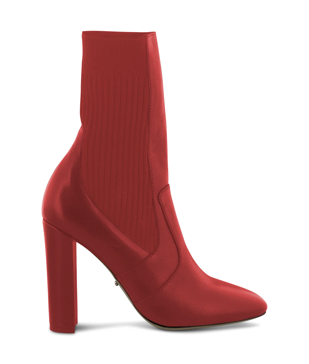 A red round toe sock boot with a combination black leather upper and ribbed sock gussets to create a fitted look. – Combination leather and synthetic upper; synthetic lining – Round toe – Covered block heel – Ribbed sock gussets – Leg Height: 18cm Heel Height: 10.5cm