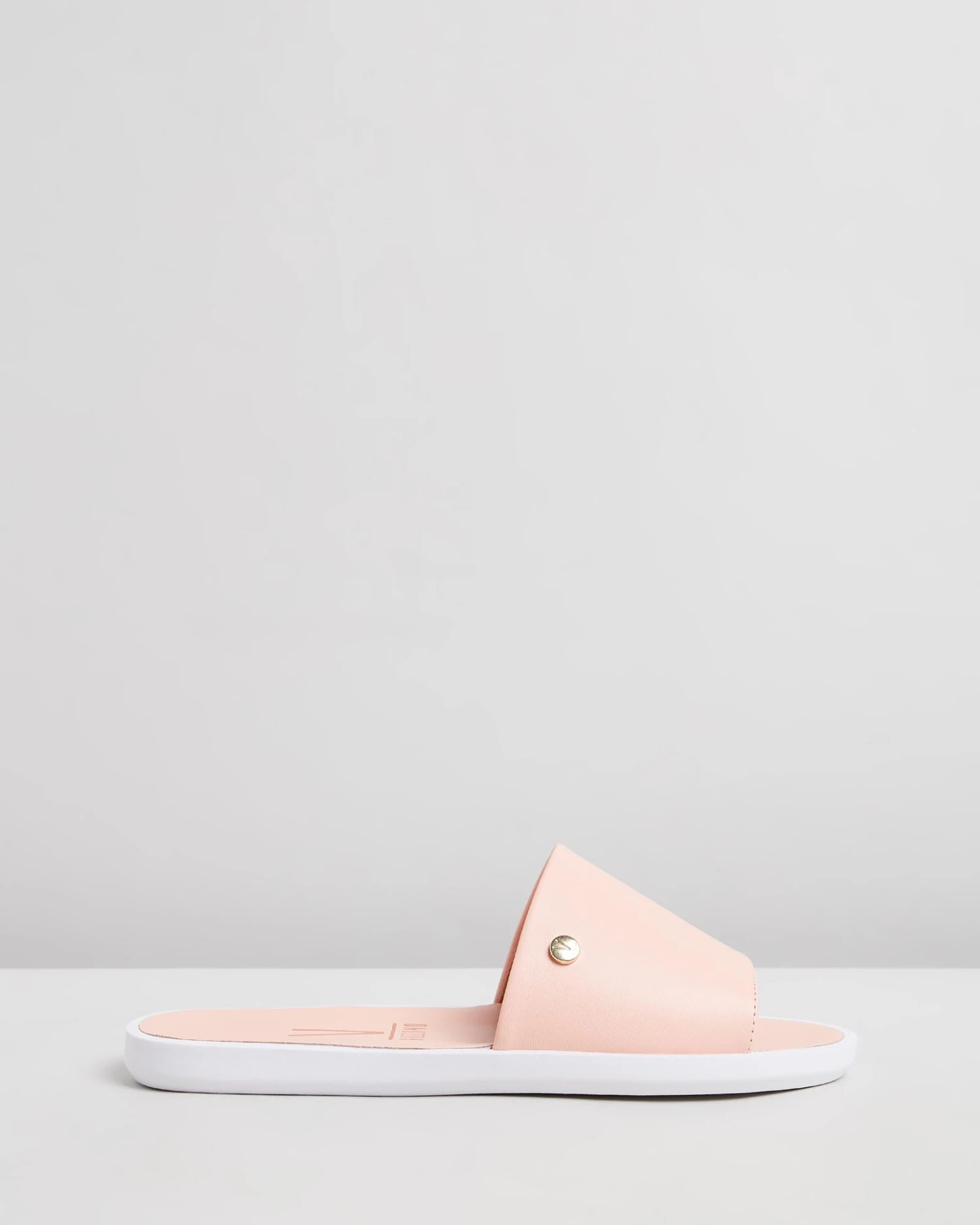 – Wide vamp strap; gold-toned medallion logo
