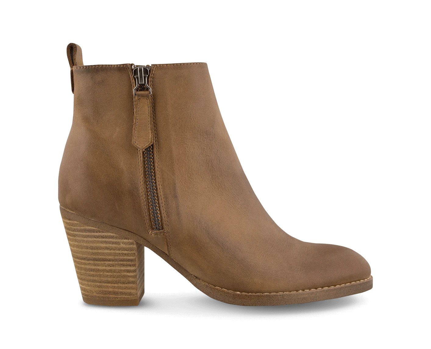 A distressed brown ankle boot with a round toe, zip closure on both sides and a block woodstack heel. – Leather upper and synthetic lining – Pull tab at centre back – Leg Height: 10.5cm Heel Height: 7.5cm