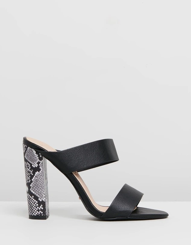 The ’90s-inspired Larsa sandals from Billini feature an open-toed silhouette set upon a snakeskin-printed block heel.
