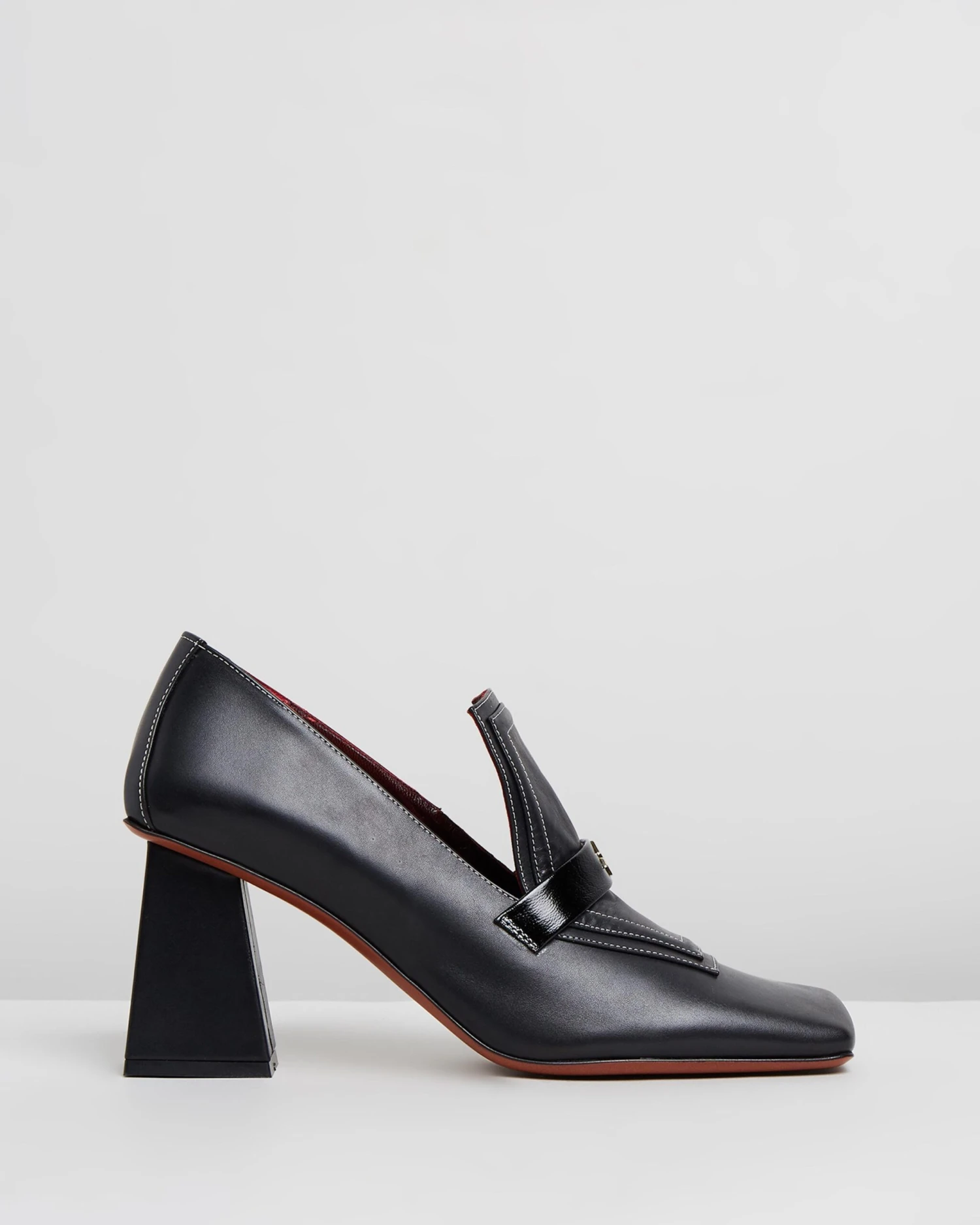 Manu Atelier give the classic loafer a twist with its flat squared toe in their iteration, Loafers. Crafted from premium leather, the contrast patent leather strap across the vamp studded with gold-toned plaque branding. – Smooth leather upper; leather lining and sole