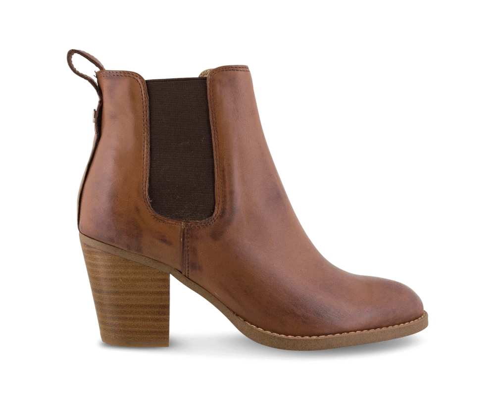 The London is a tan pull-on boot in a smooth leather and features a rounded toe shape, stretch side gussets on a block woodstack heel. – Leather upper and synthetic lining – Pull tab and stud at centre back – Leg Height: 10cm – Heel Height: 7.5cm