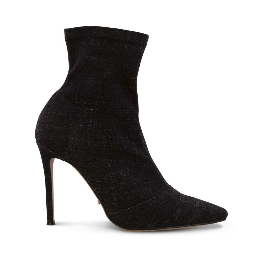 Introducing Lottie, the perfect combination of denim and the sought after sock boot trend – designed with a pointed toe shape and a sleek 10.3cm covered stiletto heel. Pair back with cropped pants for a statement look. – Material: Synthetic upper, lining and sole – Toe shape: Pointed toe – Heel type: Covered stiletto heel – Heel height: 10.3cm