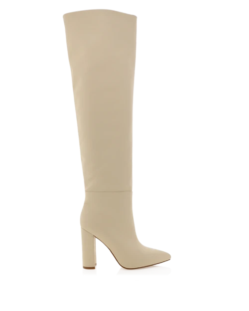 Moscow by Billini is a statement over the knee boot. Instantly elevate your off-duty or evening look with a statement pair of over the knee boots. Featuring; high block heel closed pointed toe semi-structured wide upper easy pull on design synthetic upper, lining and outsole Available in Buttercream and Espresso. Heel height 10.5cm. Our sample is AU size 6. Shaft Height 52cm. Circumference 40.7cm.