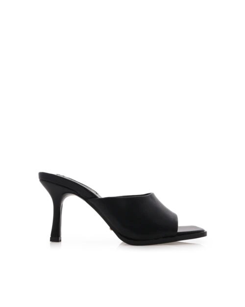 Nino by Billini is a contemporary glam mule. The statement luxe mule of the season, Nino will elevate your off-duty style. Featuring; high stiletto heel open square toe wide front strap easy slip on design open heel counter synthetic upper, lining and outsole Available in Black and Bone. Heel height 10cm.