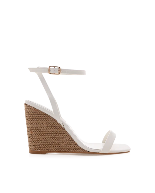 Odelle by Billini is a summery high wedge. An essential to any wardrobe, these wedges can be perfectly paired with anything from denim shorts to flowy dresses for an effortless summer look. Featuring; high wedge heel open soft square toe thin flat toe strap thin ankle strap with adjustable fastening exposed heel woven detailing synthetic upper, lining and outsole Available in White and Desert. Heel height 11cm.