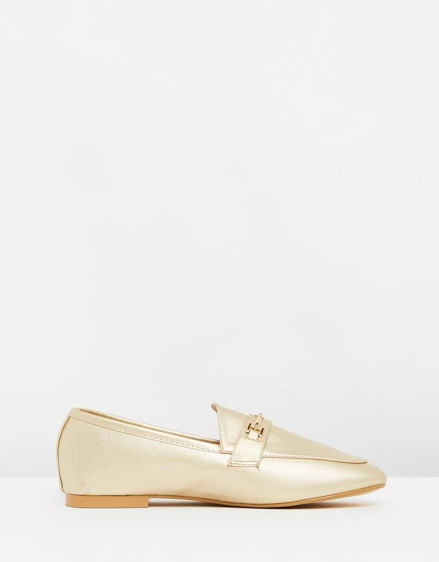 Master masculine feminine style in the Billini Opus loafers. These chic metallic slip-ons are crafted from smooth leather-look material and feature gilded horse-bit hardware. – Leather-look upper; smooth