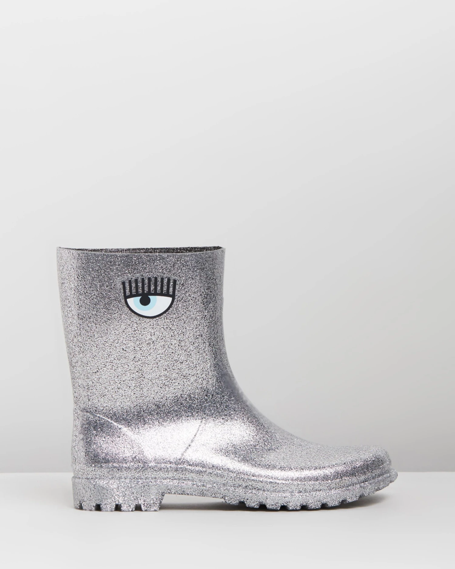 Make a sparkling splash in the Rain Boots from style-icon Chiara Ferragni. The gumboots are set to meet any wet weather needs without compromising style. Rendered in a silver glitter-fueled bliss, the mid-calf length boots feature the brand’s iconic eye print to the outer shafts. – Rubberised upper; waterproof