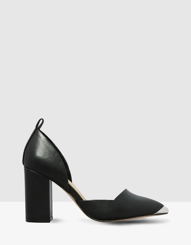 Romaine heels by Nude Footwear are the classic pumps you have been searching for. Crafted in a luxe black leather, Romaine features a detailed metallic tip, cut out design and a 9cm tall block heel. From back to back meetings, to drinks with the girls – these heels will get you there.