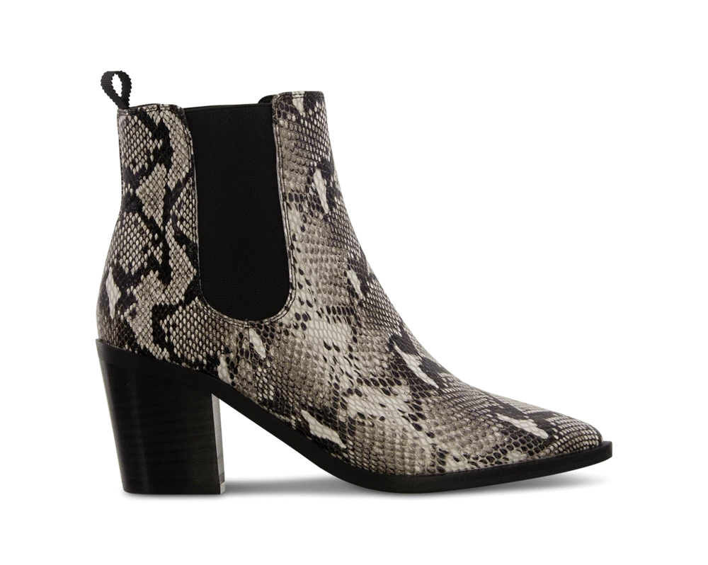 A natural snake printed leather ankle boot featuring a pointed toe, pull tab and contrast elastic side gussets on a thick block heel. – Printed leather – Block heel – Side gussets – Pointed toe – Pull tab at centre back Heel Height: 7.5cm