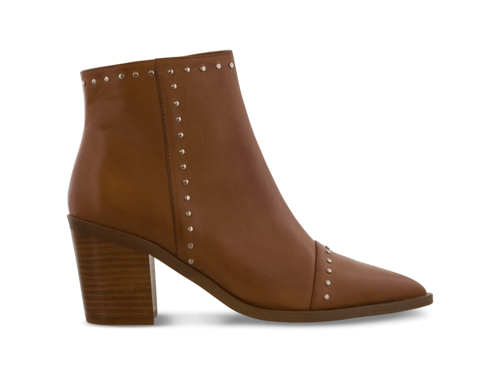 A classic leather ankle boot – showcasing contrasting silver toned studs, a 7.5cm thick block heel, an inner tan coloured zip with a pointed toe design. Leather upper & Synthetic lining – Silver hardware – Heel Height: 7.5cm