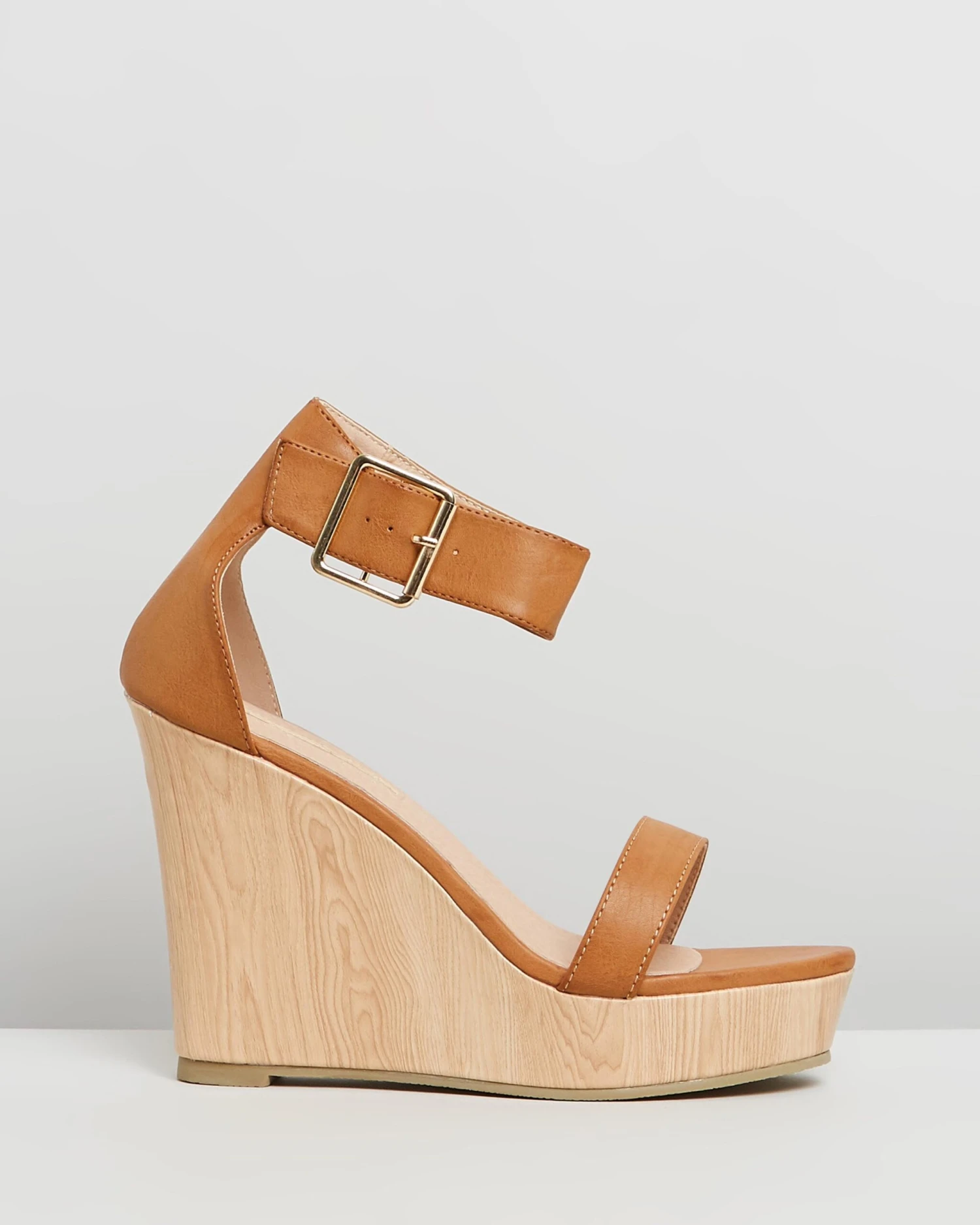 – Tan hue; gold-toned buckle; wood-look midsole