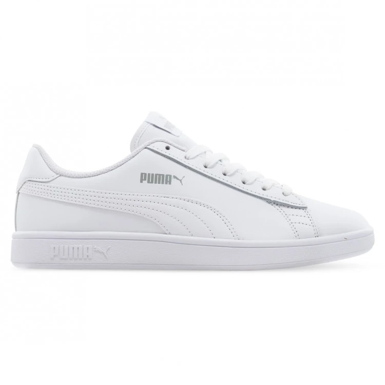 36521507 The PUMA Smash v2 initially arrived as a tennis sneaker. The on-court icon is now available as an off-court staple updated with softer supple leather and an improved fit. The Big Cat?s quintessential Formstrip sits across the lateral side with smaller hits of branding behind the tongue-tag and ankle to create a summer-ready silhouette. + Leather Upper + Full Lace Closure + Durable Rubber Outsole