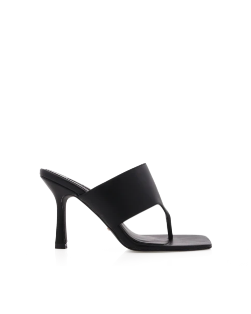 Solomon by Billini is a contemporary thong heel mule. The hottest trend of the season – thong heel mules; is a contemporary yet timeless addition to any fashion-forward wardrobe. Featuring; high stiletto heel open square toe wide thong style upper easy slip on design open heel counter synthetic upper, lining and outsole Available in Black and Army. Heel height 9cm.