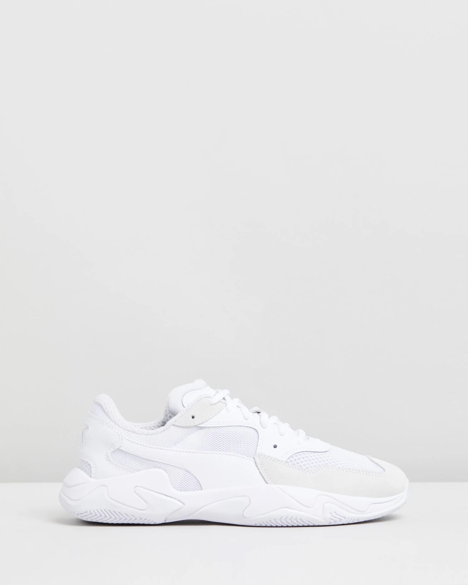 Puma channels a disruptive 90s form through their Storm Origin sneakers. Crafted to a chunky silhouette and featuring textural overlays, the stone-on-white pair is set to significantly raise your footwear game this season. – Partial mesh upper