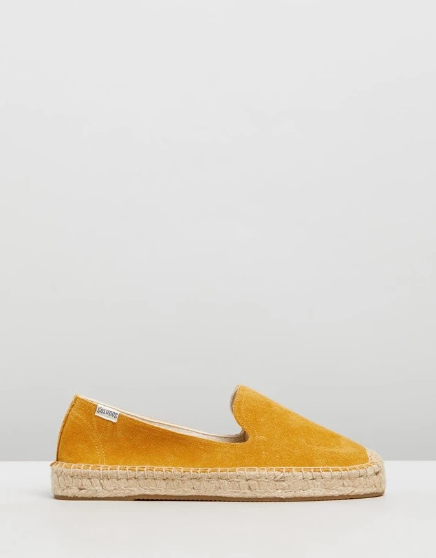 The Suede Platform Smoking Slippers from Soludos are crafted from a marigold yellow suede upper with the brand’s signature braided jute midsole. Perfect with a denim mini or linen dress.- Suede upper