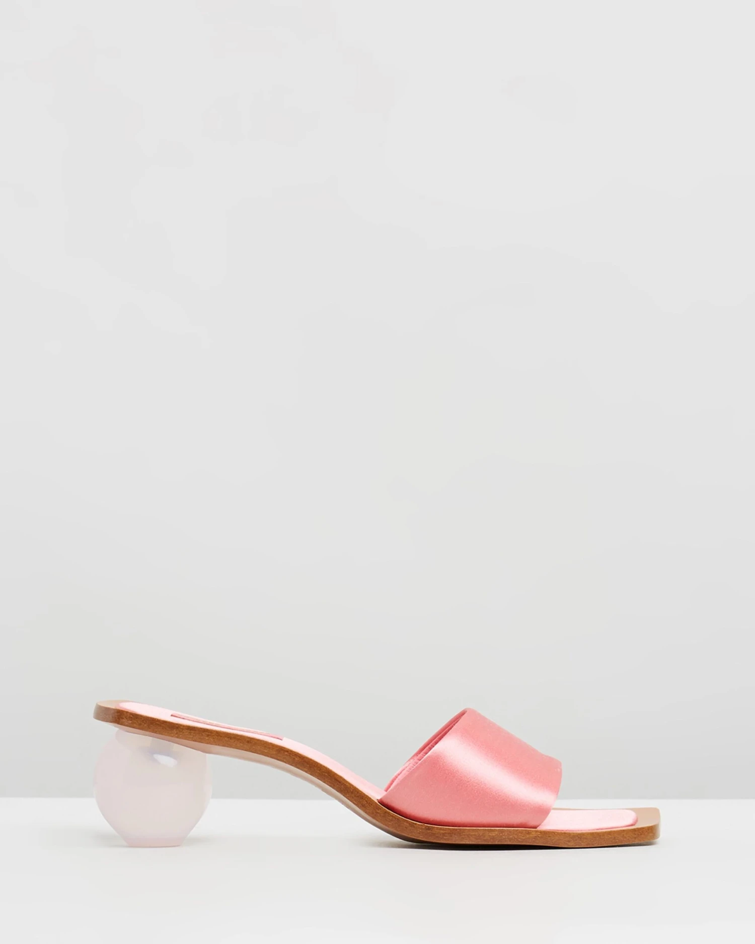 Aptly-named Los Angeles-based label Cult Gaia’s philosophy to create wearable objets d’ Art is succinctly translated with the sculptural Tao Sandals. Set atop a hand-carved spherical resin heel, the mule silhouette is expertly crafted from decadently sweet bubblegum pink satin and cut to an of-the-moment square toe. Let them stand out beneath a billowy midi dress or a sumptuous silk slip for a contemporary slant.