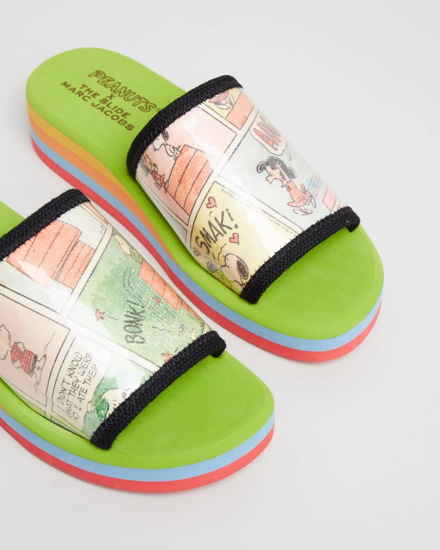 In keeping with Marc Jacobs’ affinity with pop culture, The Slide Peanuts X Marc Jacobs shoes are a playful statement pair that will inject a sportive theme into your warm-weather rotation. Featured in a lime green shade with a stacked rainbow platform sole and comic strip print to the vamp, the slip-on sandals are a throwback to youth culture and nostalgic summer days.- Patent upper