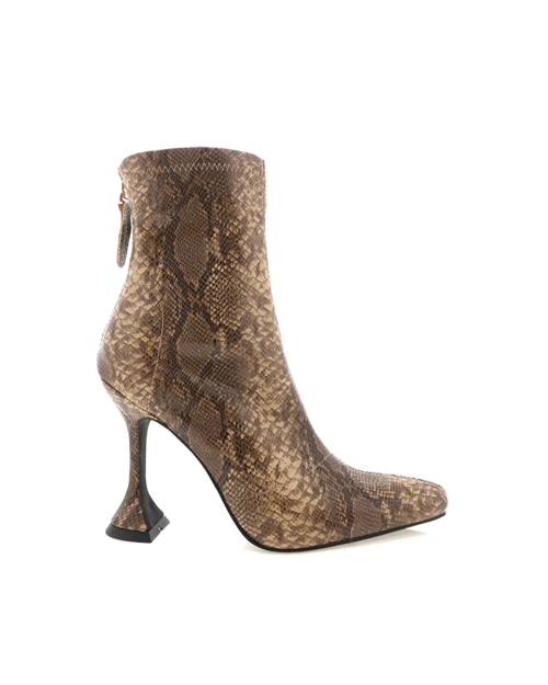 Trinity is a flared heel sock boot, exclusively available to Billini. This new look glam boot is a must-have for any fashion forward wardrobe, with its distinct and unique features making this a true statement piece. Featuring; high flared stiletto heel closed soft pointed toe high cut ankle boot upper fitted sock boot design exposed back zipper fastening synthetic upper, lining and outsole Available in Brown Python and Black Suede. Available exclusively to Billini. Heel height 10.5cm.