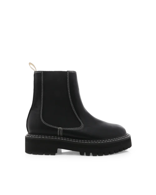 Valeska by Billini is an on-trend combat ankle boot. Make a statement this season with a fresh take on a combat boot, featuring contrast stitching for an instant outfit elevator. Featuring; chunky rubber sole closed round toe structured upper with elasticated side gusset easy slip with pull back tab closed heel counter synthetic upper, lining and outsole Available in Black/White Contrast. Heel height 4cm.