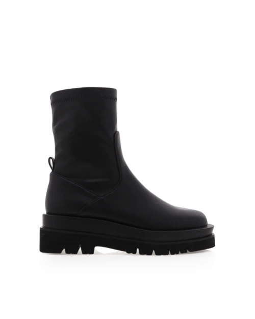 Wagner by Billini is a combat sock ankle boot. Combat meets sock boot in this versatile and contemporary ankle boot. Featuring; chunky rubber sole closed round toe sock style upper easy pull on design with pull back tab synthetic upper, lining and outsole Available in Black and Buttercream. Heel height 6cm.