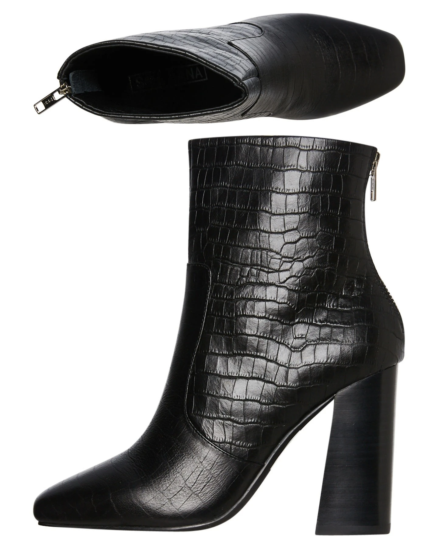 Features: Style: Women’s Boots Colour: Black Croc Upper Material: Leather Outsole Material: Synthetic Heel Height: 10cm Ankle boot with crocodile leather upper Leather inner lining Shaped front panel Slim, pointed toe Back zip closure Stacked wood heel Size + Fit Guide: EU sizes, US conversion below Please refer to the Size Chart for further information 5: 35 EU 6: 36 EU 7: 37 EU 8: 38 EU 9: 39 EU 10: 40 EU 11: 41 EU