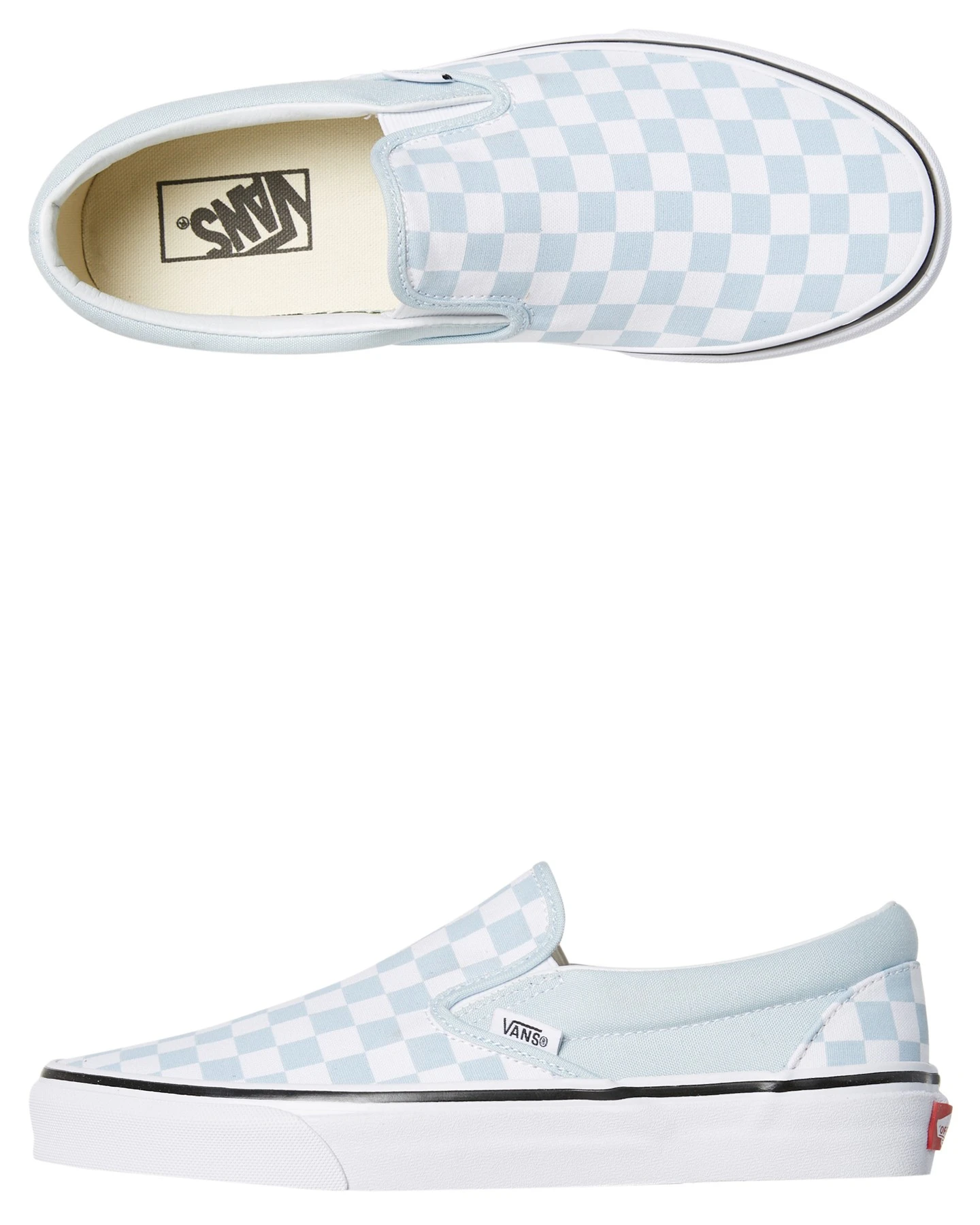Features: Style: Women’s Slip On Colour: Baby Blue Upper Material: Canvas Outsole Material: Rubber Elastic side gores Checkerboard print Vans label detailing Signature Vans waffle outsole Size Guide: US Sizing Please refer to the Size Chart for further information