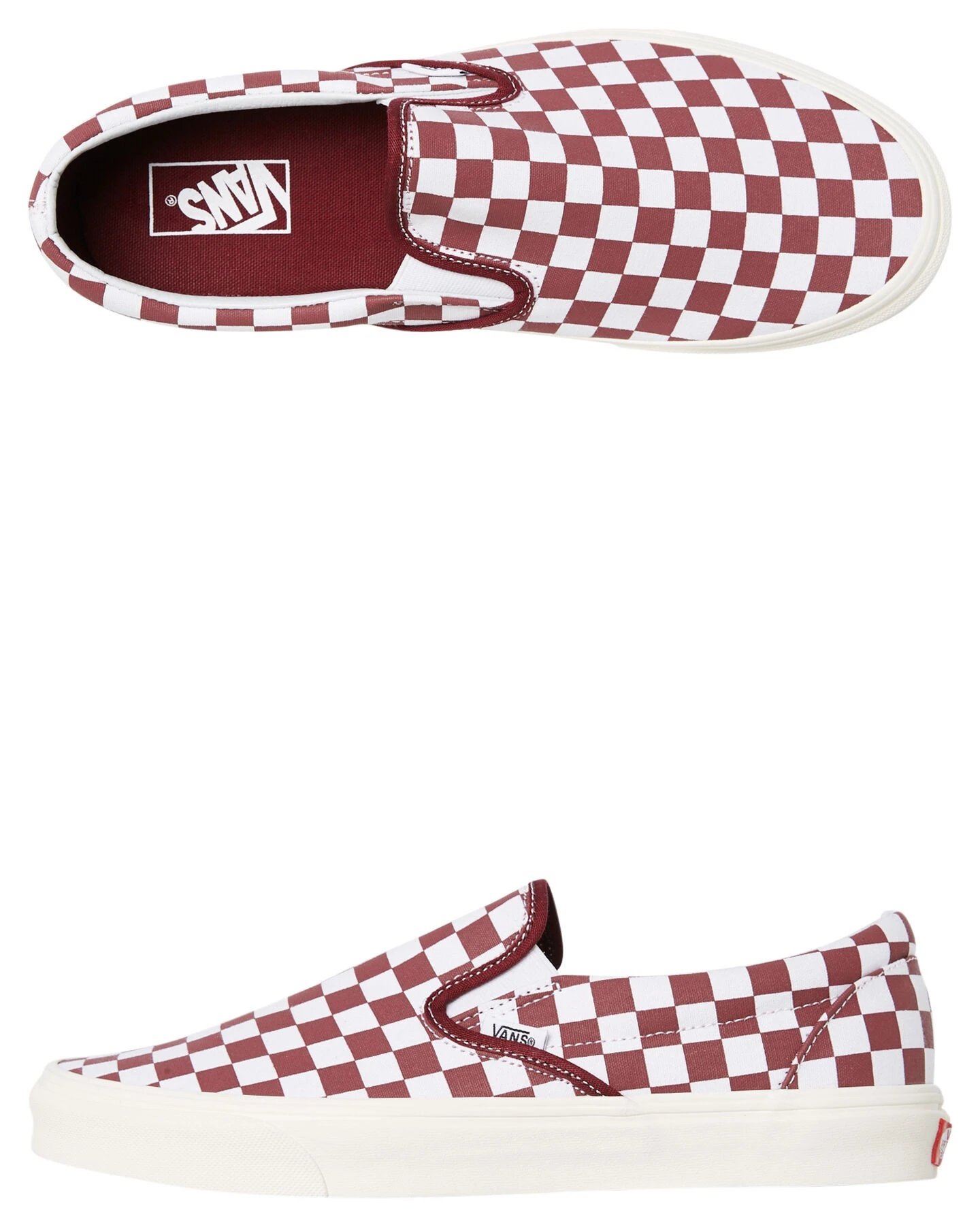 Features: Women’s Sneakers Colour: Port Material: Canvas upper Slip on design All over checkered print Padded ankle Vans signature vulcanized Waffle Outsole Size + Fit Guide: US sizes Please refer to the Size Chart for further information